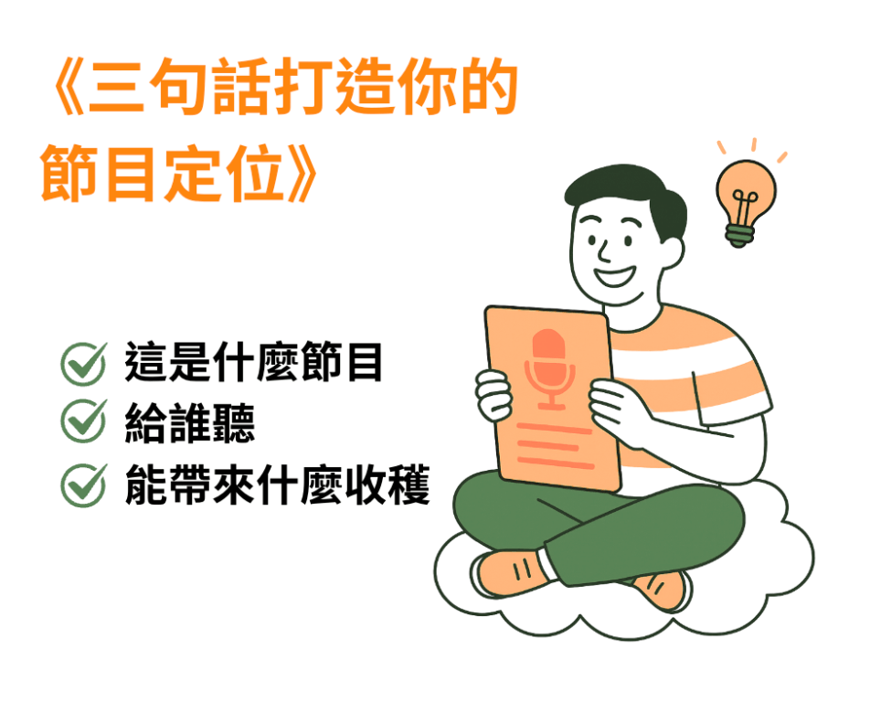 在挑戰裡,你會學到一個「三句話公式」,讓你用最短的篇幅清楚交代:這是什麼節目、給誰聽、能帶來什麼收穫。這將成為你未來宣傳與自我介紹的基礎。